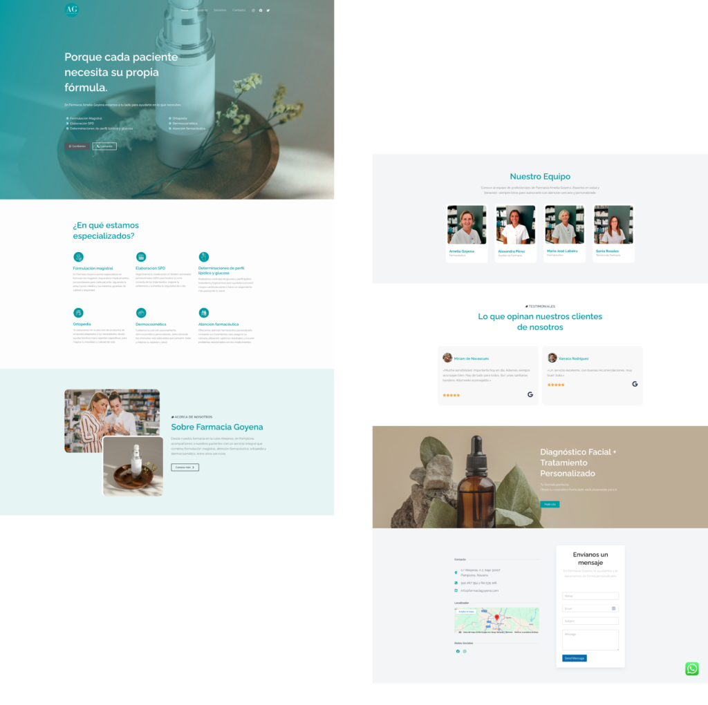 “Because every patient needs their own formula.” That idea guided the entire direction of this website: a clean, warm, and approachable experience for a pharmacy in Pamplona, Spain — built around personalized care.